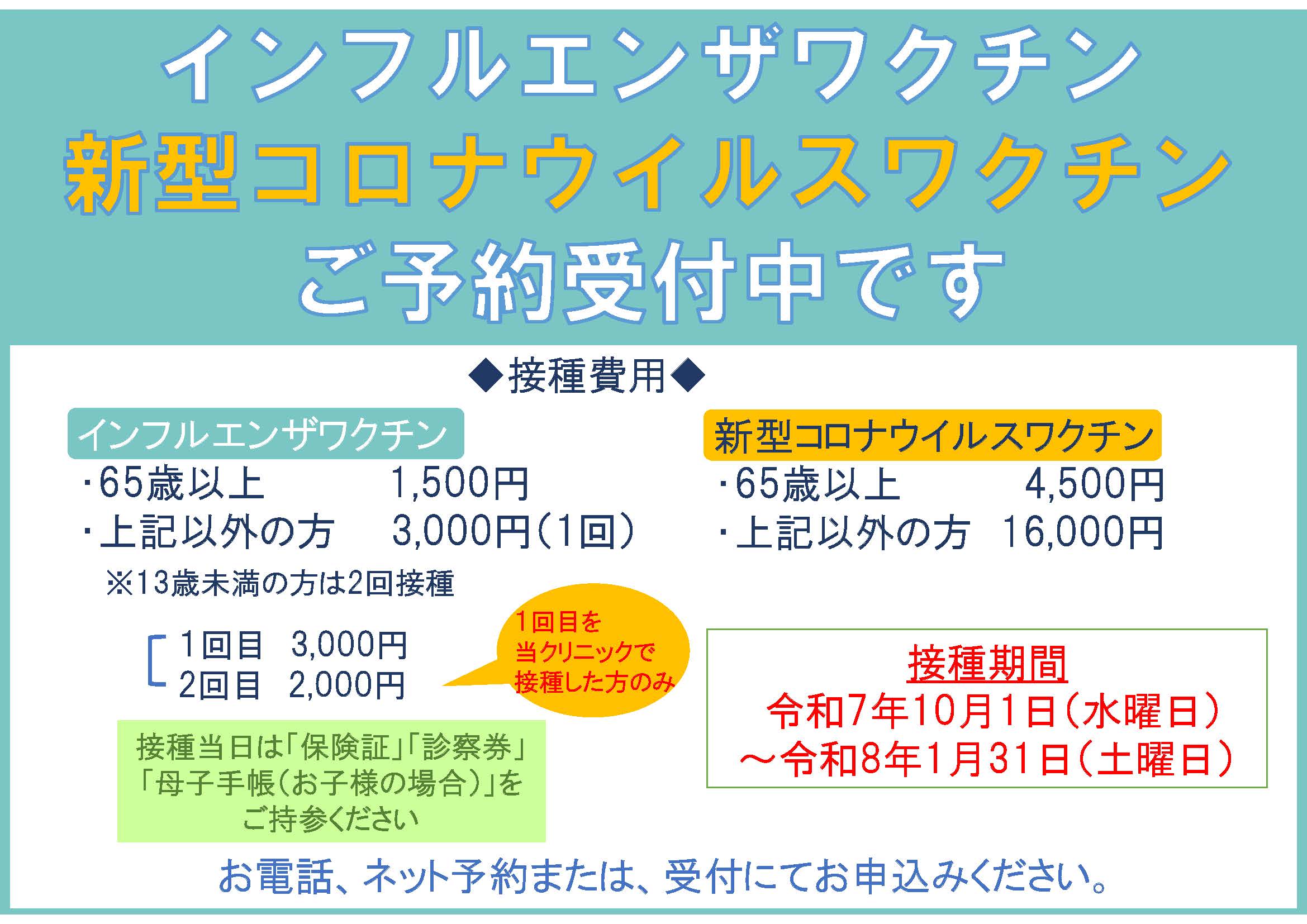 2025.09.20 | インフルエンザワクチン・新型コロナウィルスワクチンご予約受付中です。 接種期間 令和7年10月1日(水)~令和8年1月31日(土) お電話、ネット予約、受付にてお申込みください。 ![]() |